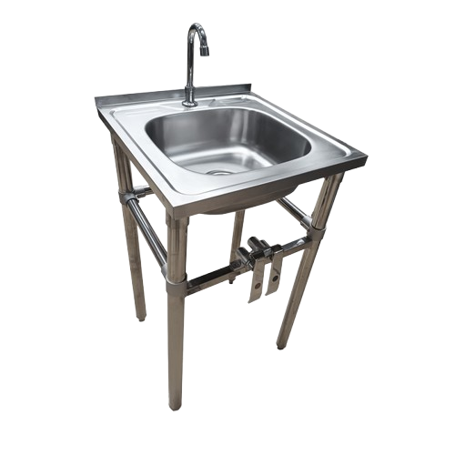Lavamanos 500x500x850 mm acción rodilla Ita. Fabricado en acero inoxidable, incluye grifería (agua fría y caliente) con llave cuello cisne de 20 Cm. + desagüe de 1 1/2.