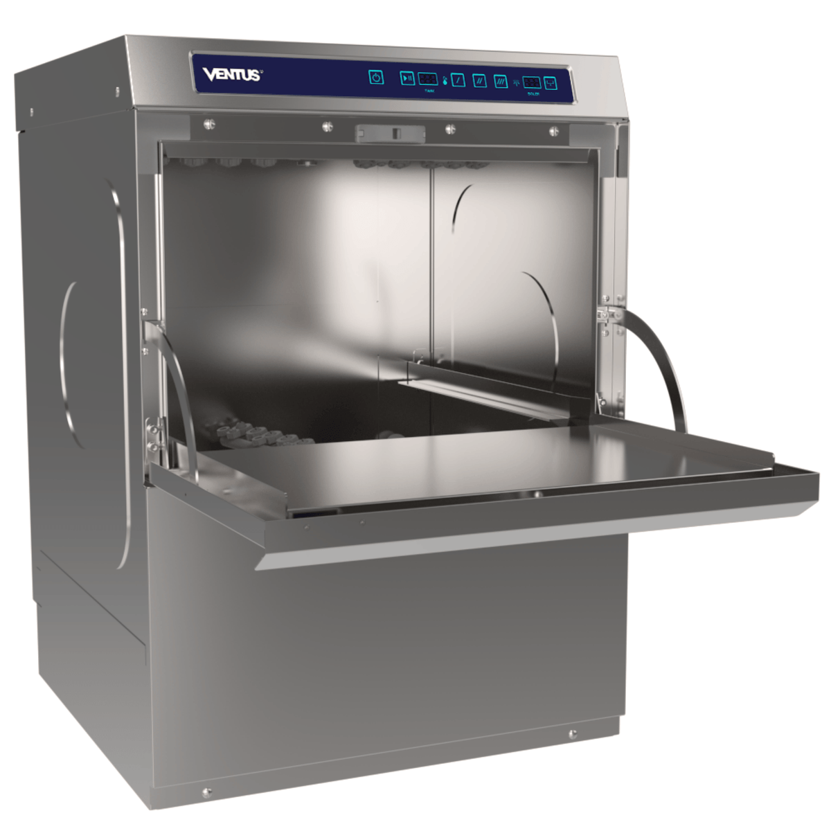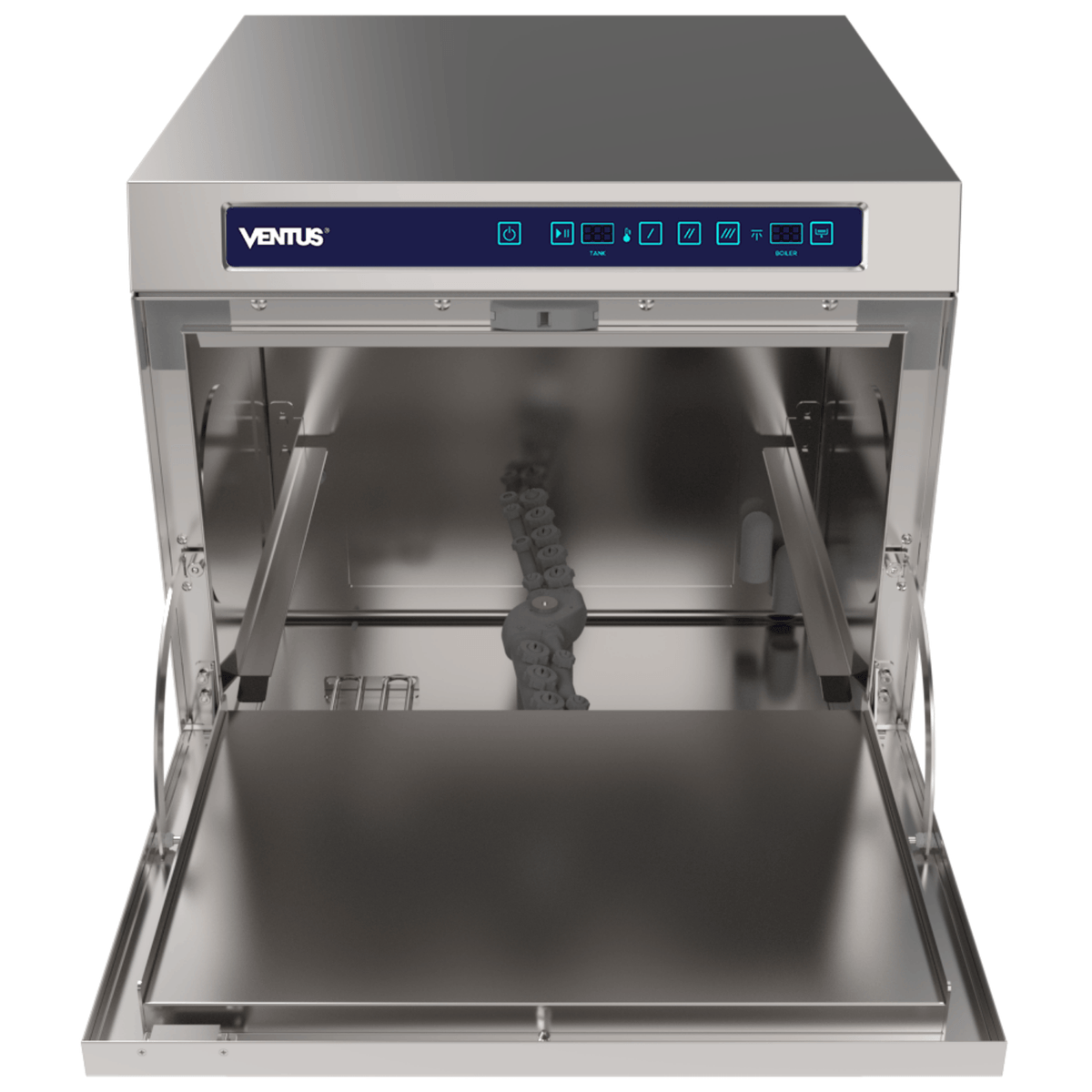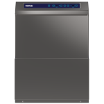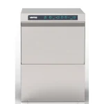 Este lavavajillas profesional cuenta con 3 programas de lavado (90, 120 y 180 segundos), ajustables según el tipo de vajilla y nivel de suciedad, controlados mediante un timer electrónico. Incorpora la función de enjuague Thermo-Stop, que garantiza la esterilización con agua a 85°C proveniente de la caldera, la cual se calienta durante el ciclo de lavado. El equipo incluye sistema de alarma audible al finalizar el lavado, panel de control con códigos de falla, y sistema de seguridad que detiene el funcionamiento al abrir la puerta. Tiene capacidad para utensilios de hasta 28 cm, platos de 32 cm, vasos y objetos de hasta 29 cm. Sus brazos de lavado y enjuague, junto con los filtros, son fácilmente desmontables para una limpieza eficiente. Incluye como accesorio estándar un rack de 50 x 50 cm, bomba de drenaje integrada y requiere el uso de un ablandador de agua para un óptimo funcionamiento.