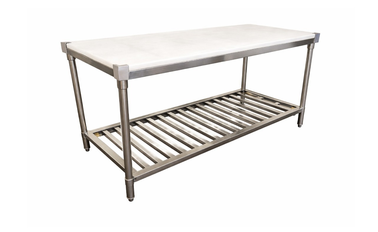 Mesón de trabajo de Acero Inoxidable con cubierta de polipropileno blanco y parrilla inferior son ideales para higiene y resistencia en cocinas profesionales (Mesón ideal para cortar carne, mariscos, pescados, etc.). Nuestros mesones de Acero Inoxidable se diferencian por su parrilla inferior para un almacenamiento mas eficiente y aprovechamiento del espacio, en el cual es posible almacenar u organizar utensilios o cualquier otro elemento de su cocina.